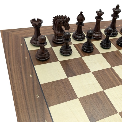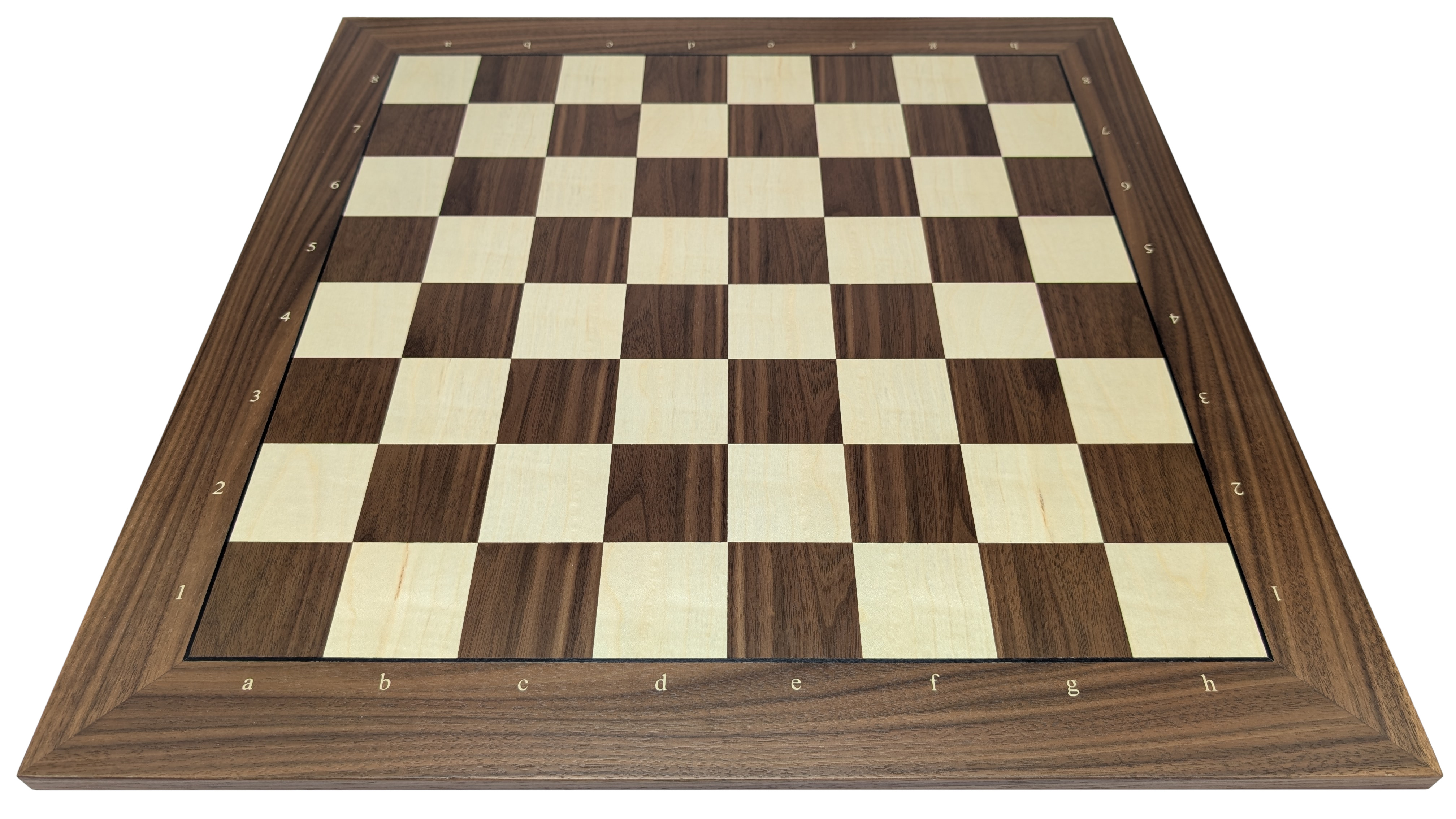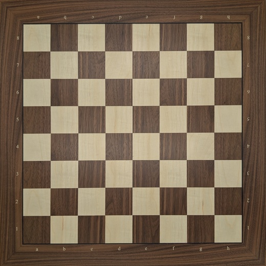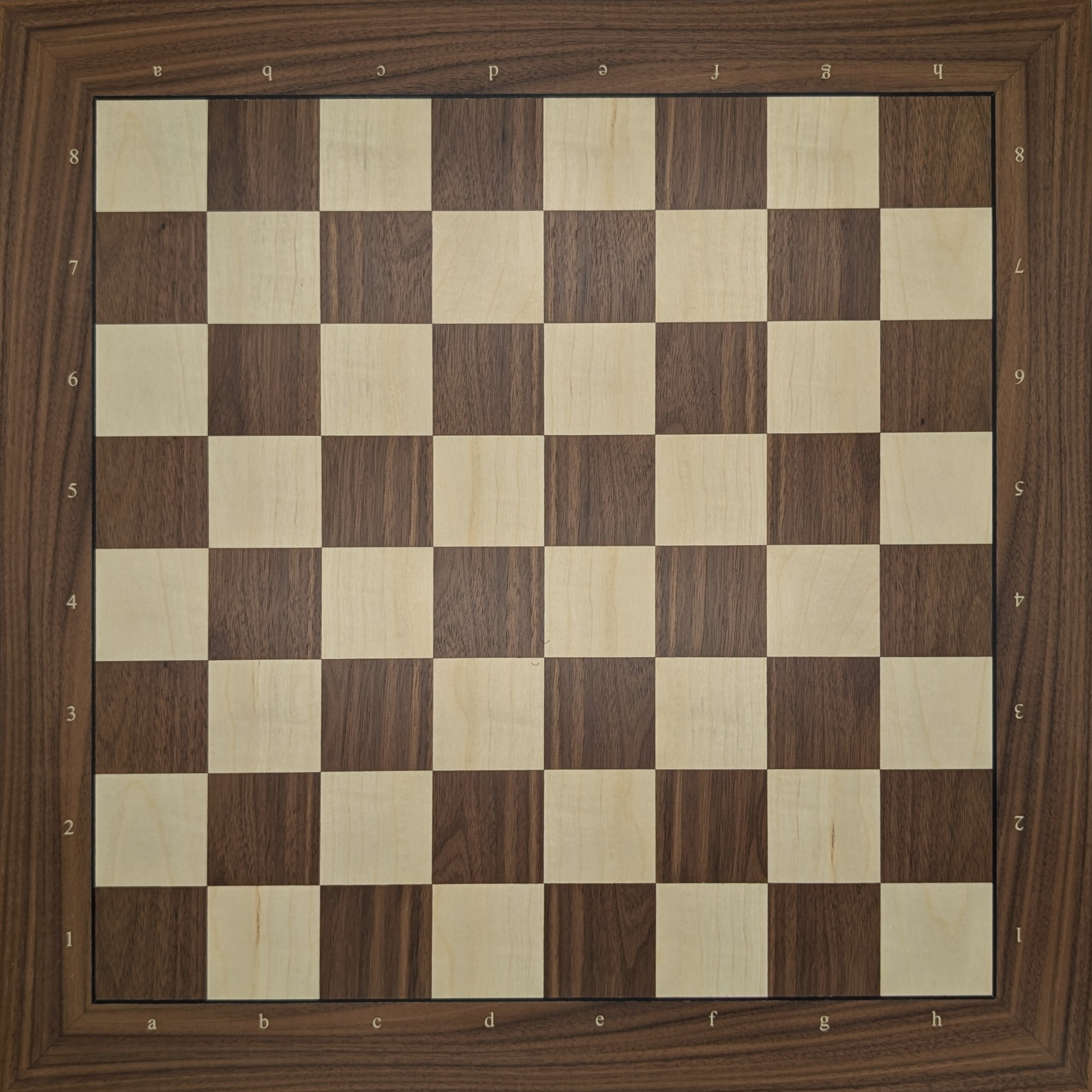 Et flott, solid sjakkbrett i mørk valnøtt og lys lønn. Brettet har en elegant, blankere finish og en tynn, dekorativ linje som rammer inn spilleflaten. Brettet er ikke sammenleggbart og har diskré notasjon langs kantene.