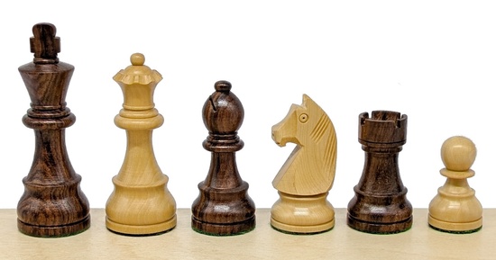 De mørke brikkene er fremstilt av vakkert akasietre, komplementert av lyse brikker i tradisjonelt buksbom. Hver brikke er vektet med metall for å sikre god stabilitet og en behagelig følelse under spillet. Undersiden er belagt med filt for å beskytte sjakkbrettet mot riper.